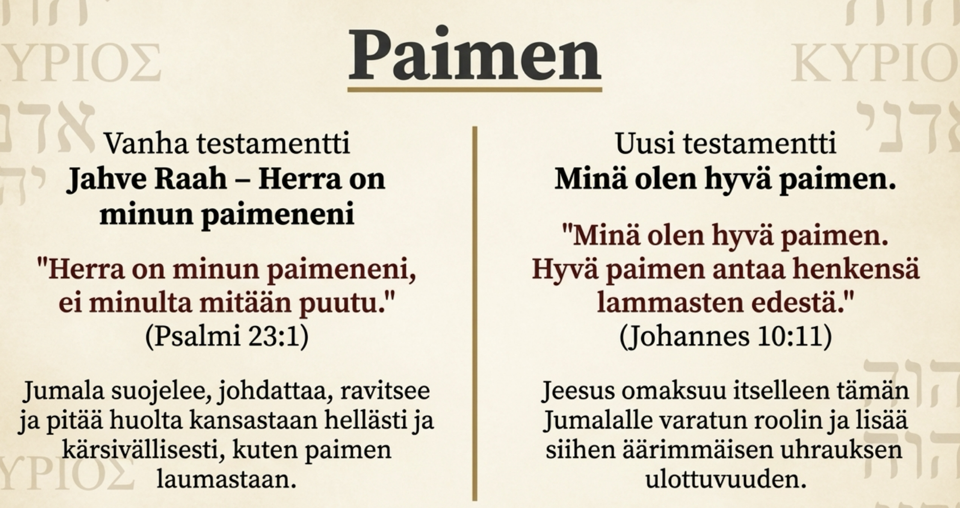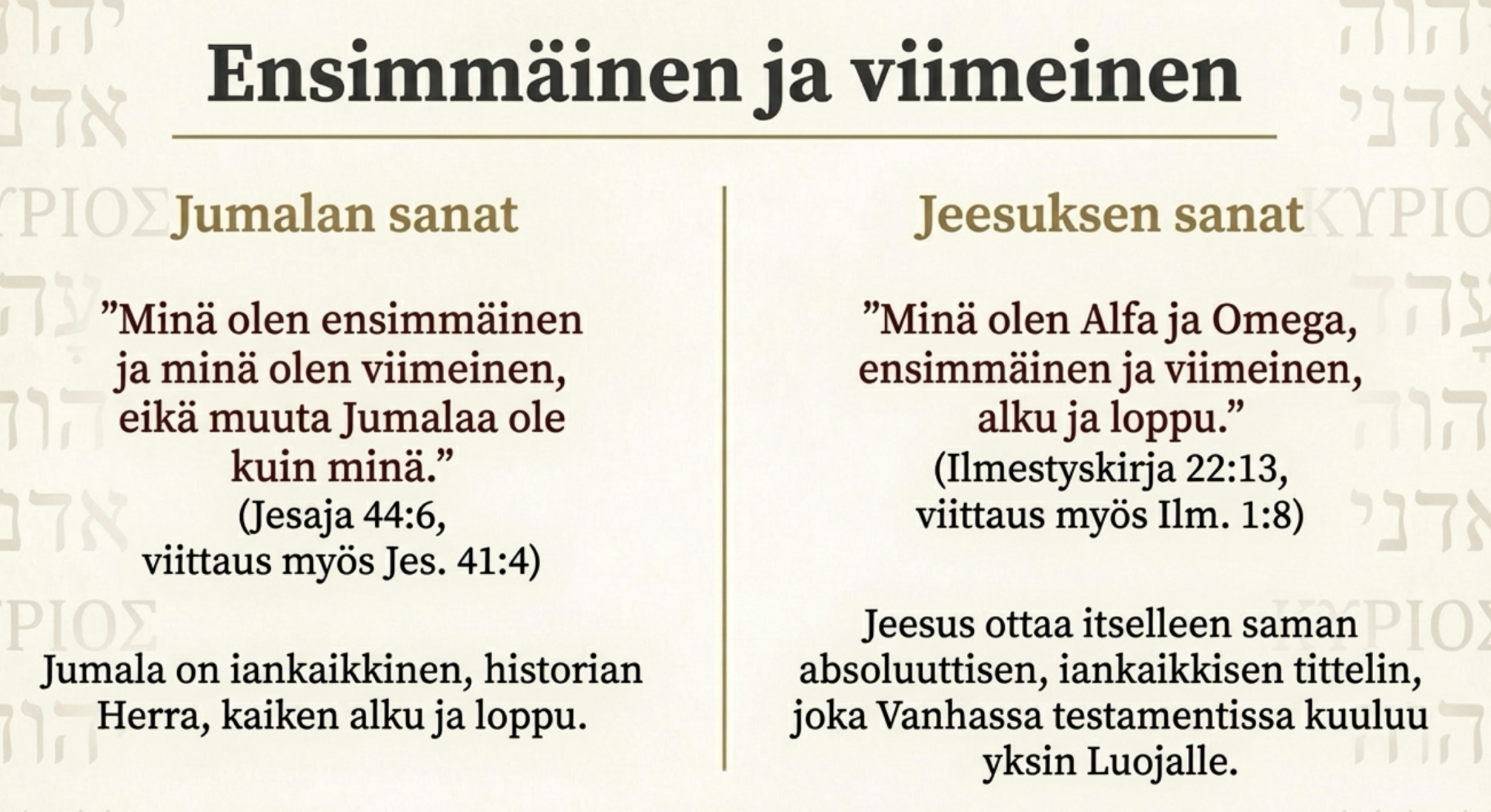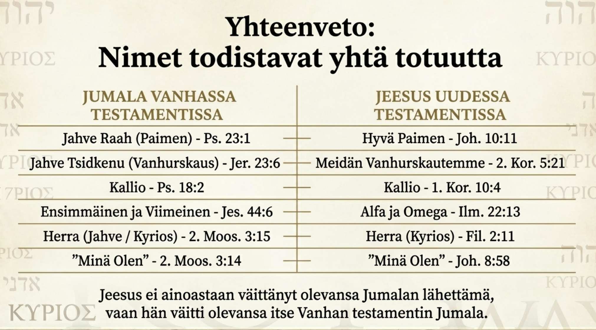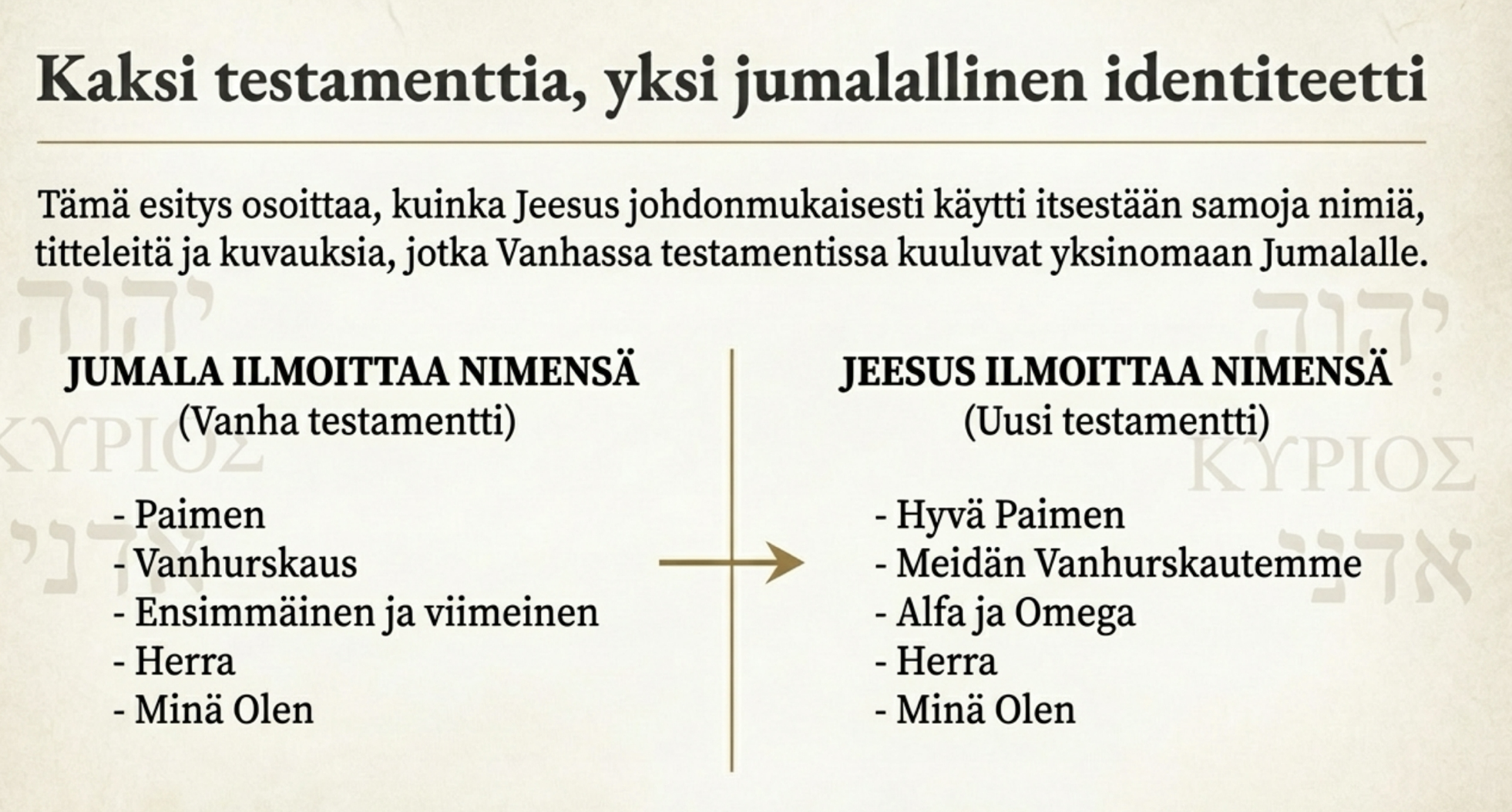 Palataan kysymykseen miten Jeesus ilmoitti itsensä olevan Vanhan Testamentin Jumala? Hän ilmoitti olevansa sama ilmoittamalla omiksi nimikseen samat nimet millä Jumala ilmoitti itsensä Vanhassa Testamentissa.