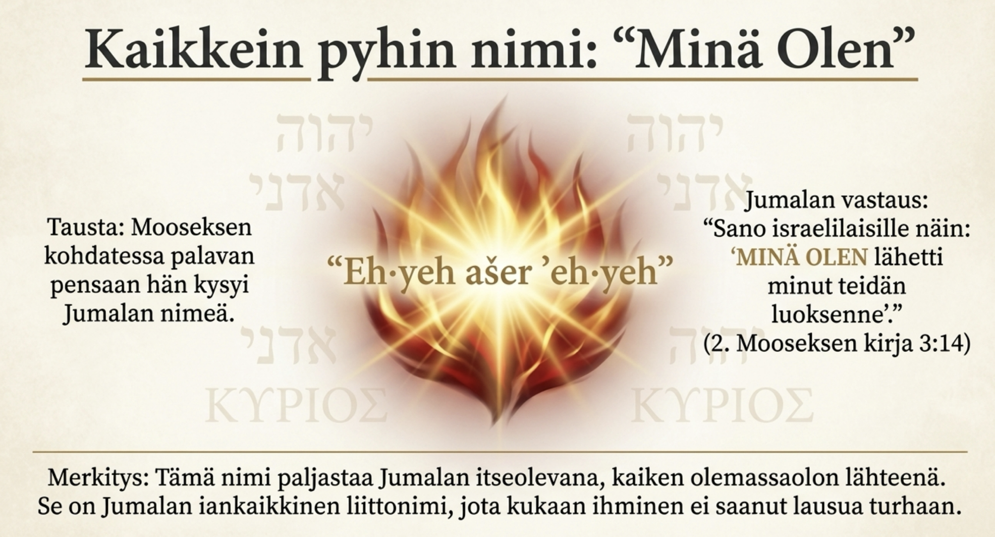 15 Jumala sanoi vielä Moosekselle: ”Sinun tulee sanoa israelilaisille: ’Jahve, Herra, teidän isienne Jumala, Abrahamin, Iisakin ja Jaakobin Jumala, on lähettänyt minut teidän luoksenne.’ Se on oleva minun nimeni ikuisesti, ja sillä nimellä minua kutsuttakoon sukupolvesta sukupolveen.Samoin Jumala ilmaisi itsensä kautta VT.n: ”Minä olen” ja jatkamalla usein myös ”MInä olen se, joka olen”.